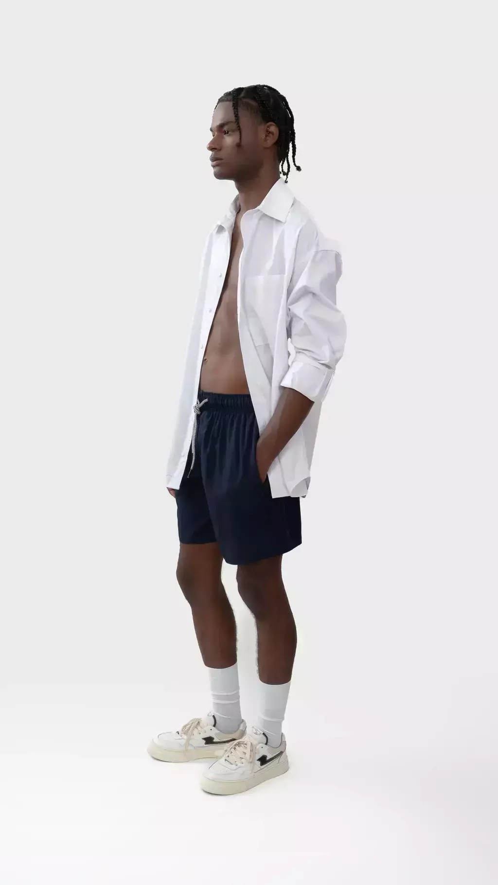 Calção em estilo esportivo confeccionado em um tecido técnico leve com elastano. Cós elástico ajustável com cordão. Bolsos laterais e atrás, barra a fio.